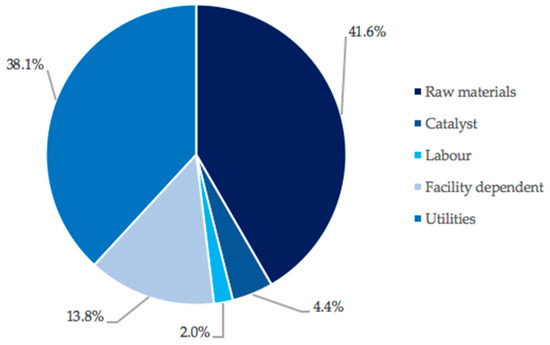 Last but not least, Figure 4 also shows that utilities constituted the second largest contribution to Area 2 operating costs (with 38.1%). This was mostly due to the requirement of high-pressure steam for the cellulose conversion reactor, where high temperatures (483 K) are required. This contribution could be mitigated by heat integration across the process (because the re-use of heat generated inside the process can reduce the need for external energy consumption, such as electricity and steam [34]) or the development of efficient biological processes that operate at milder conditions.