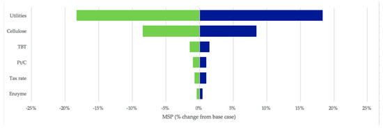 A sensitivity analysis of a process reveals which factors affect the process the most. Figure 5 shows a sensitivity analysis for the process, used to assess the impact that possible changes (within a certain range) of such key factors would have on the profitability of the process. For this purpose, cost-driving parameters such as the price of cellulose, catalysts, enzymes, and utilities, as well as the tax rate, were changed to 50% below and above the base-case values.