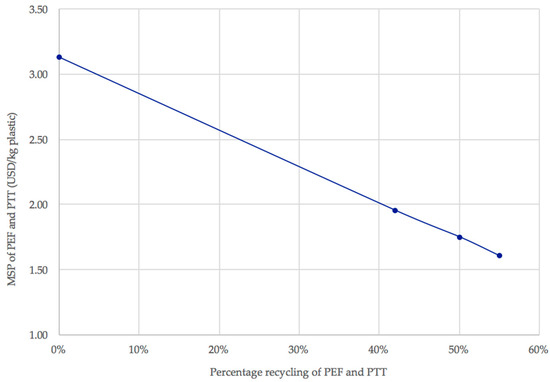 A recent study by Fernando Foncillas et al. [35] underlined the importance of public subsidies in the development of economically viable biorefineries. Clearly, dedicated subsidies could facilitate the transition towards 2G plastic biorefineries as well, thus supporting the bio-based economy. Moreover, policy targets and increasing recycling rates may also affect the economic viability of PEF and PTT. It is, therefore, important to investigate the potential impact of such policies. In 2015, the European Commission proposed that at least 55% of all plastic packaging should be recycled by 2025 [36], although it was estimated that only 42% of plastic was recycled in the European Union in 2017 [37]. How would those recycling rates affect the plastic biorefinery economy? Figure 6 shows different recycling scenarios for the upcycled PEF and PTT (0%, 42%, 50% and 55%) and their effect on the MSP.