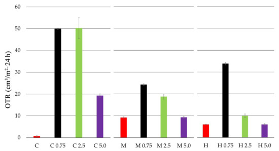 The oxygen transmission rate (OTR) for chitosan and chitosan-propolis film samples is presented in Figure 1.