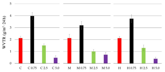 All tested pure chitosan films (C, M, H) presented similar values of water vapor transmission rate (WVTR). The highest WVTR values were observed for the films of all chitosan types with propolis extract at 0.75% concentration. The WVTR values for chitosan films with 0.75% EEP was 3.97 (g/m2 × 24 h) for C 0.75, 3.19 (g/m2 × 24 h) for M 0.75 and 3.76 (g/m2 × 24 h) for H 0.75. In turn, the addition of 2.5% and 5.0% propolis extracts caused lower WVTR values. The film containing high molecular weight chitosan with 5.0% EEP was characterized by the lowest WVTR values—0.39 (g/m2 × 24 h). The obtained results indicate that the concentrations of propolis affect the value of the WVTR parameter.