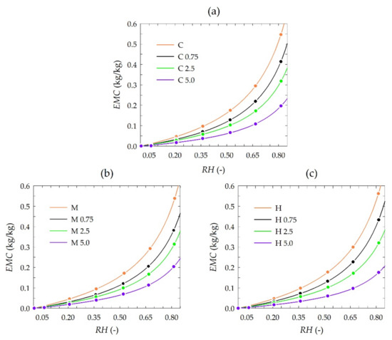 where: Mm (kg/kg) is the monolayer moisture content, C (-) is the equilibrium constant related to the monolayer sorption, K (-) is the equilibrium constant related to the multilayer sorption and RH (-) is the relative humidity. It is assumed that Equation (2) describes water molecule bonding to sorption sites (monomolecular layer). Water molecules in the monolayer become secondary sorption sites and additional layers of water are formed (multilayer sorption). Coefficients of Equation (2) were estimated using the Levenberg–Marquardt iterative algorithm with SigmaPlot 9.0 software.