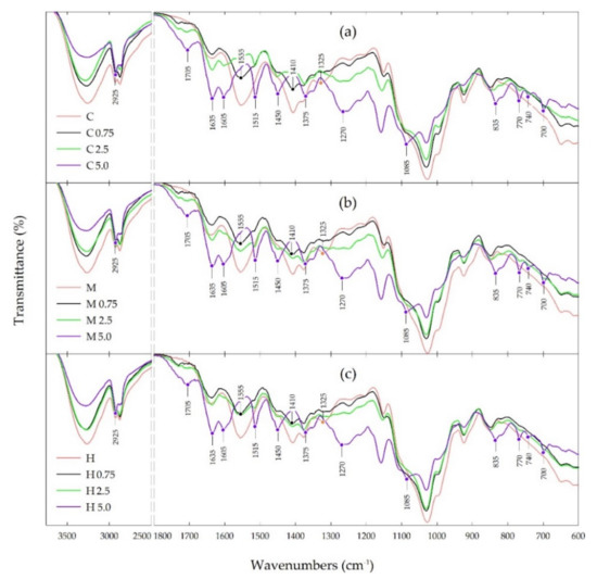 The FTIR spectra of various types of chitosan films and chitosan films with propolis extract at a concentration in the range of 0.75–5.0% are presented in Figure 4.