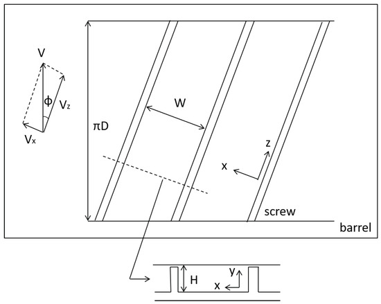 Figure 1 shows an unwound geometry of a single screw extruder. The screw is modeled by a rectangular channel with a height H and a width W, and the barrel is modeled by a moving flat plate covering the screw channel. The velocity of the plate is , where D is the inner diameter of the barrel and N is the screw rotational speed.