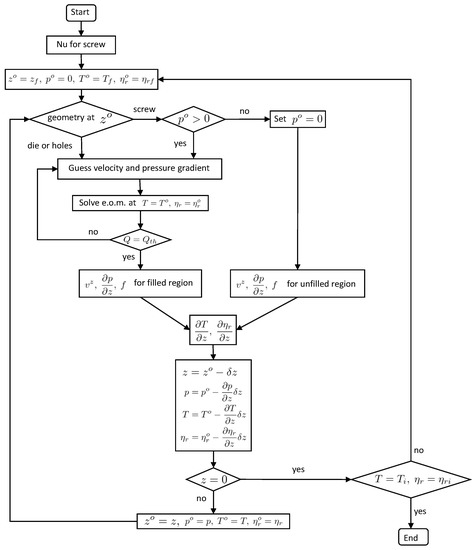 Figure 2 shows the flowchart of our numerical calculation. Our goal is to obtain pressure p, temperature T, and zero-shear viscosity at a reference temperature for all axial positions of the extruder when an initial temperature and an initial zero-shear viscosity at a reference temperature are given. From now on, we denote z as the axial coordinate of the extruder.