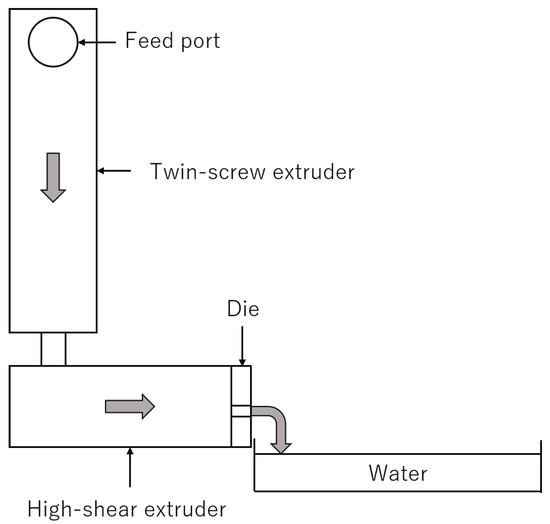 The screw configuration and the barrel temperatures of the twin-screw extruder in the experiments are shown in Figure A1. The total length was 1260 mm and the inner diameter of the barrel was 26 mm. The flow rate and the screw rotation speed used in the experiments were summarized in Table A1.