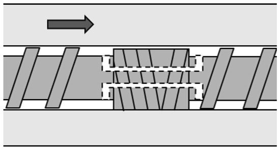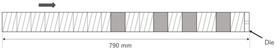 The screw configuration of the high-shear extruder is shown in Figure 9. The screw elements with a channel depth of 3 mm, a lead of 15 mm, and a length of 45 mm were used. The die with a diameter of 4 mm and a length of 25 mm was used. The flow rate was 4.8 kg/h. The barrel temperature was set to 195 C and 300 C. The screw rotational speeds of 100, 1000, and 2000 min were chosen. For resin, PP1 was used. The temperature of PP at the exit of the die was measured.