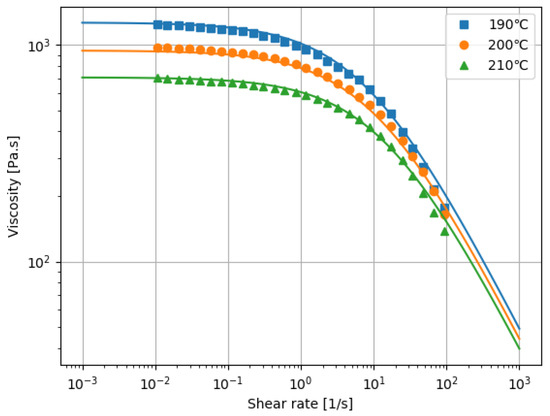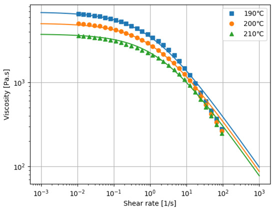 Two different grades of homo-polypropylene (F-704NP and J107G, Prime Polymer, Tokyo, Japan) were used. The melt flow rates were 7.0 and 30 g/10 min, respectively, measured in accordance with the ISO 1133:97 standard. In the following, we denote F-704NP as PP1 and J107G as PP2. To determine the parameters of the viscosity model Equations (6) and (7), the shear viscosity was measured by a modular compact rheometer (MCR 102, Anton Paar, Graz, Austria). The steady shear rate ranged from 0.01 to 100 s and the measurement temperatures were 190, 200, and 210 C. The reference temperature was set to 200 C. The resultant model parameters of PP1 and PP2 by curve fitting were given in Table 1. The viscosity data and curves are shown in Figure 5 and Figure 6.
