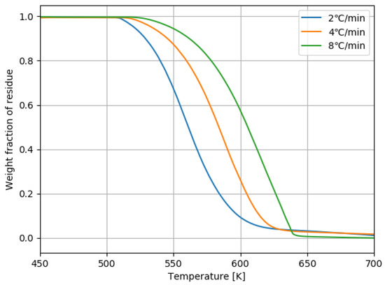 To determine the activation energy of PP, the Kissinger’s method was used, which was reviewed in [20]. To obtain the weight loss data for thermal degradation of PP, the simultaneous thermogravimetric analyzer (STA7200, Hitachi High-Tech Science, Tokyo, Japan) was used. For samples, PP1 was used. The samples were purged with the air at a flow rate of 30 mL/min because the air was expected to exist in the high-shear extruder. Constant heating rates of 2, 4, and 8 C/min were used. For each case, the sample weight was approximately 10 mg. The results of the thermogravimetric analysis (TGA) are shown in Figure 7. The temperature T at a given weight fraction of residue X was found for each heating rate . The Kissinger’s method uses the following equation: