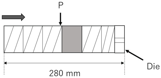 The screw configuration of the high-shear extruder is shown in Figure 10. The screw was mainly composed of screw elements with a channel depth of 3 mm, a lead of 22.5 mm, and a length of 45 mm. The last screw element had the same channel depth as the previous ones with a different lead of 15 mm and a different length of 30 mm. The shaded region in Figure 10 represents the reverse flighted screw element with through-holes which was shown in Figure 4. This element possessed four through-holes with a diameter of 2 mm and a length of 45 mm. The die of the high-shear extruder had the diameter of 2 mm and the length of 25 mm. The barrel temperature was set to 195 C. The flow rate was 4.8 kg/h. The screw rotational speeds of 2000, 2500, 3000, and 3600 min were used. For resin, PP1 was used. The temperature of PP was measured at the point P in Figure 10 and the exit of the die. The zero-shear viscosity of the processed PP was measured at the reference temperature 200 C.