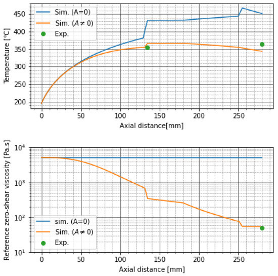 Table 2 shows the simulation and experimental results described in Section 3.3. When the barrel temperature was raised from 195 C to 300 C with the fixed screw rotation speed of 100 min, the calculated Nusselt number was a little bit increased. Therefore, the calculated temperature at the exit of the high-shear extruder in our simulation was also changed compared to the calculated value of with , which was the Nusselt number evaluated at min and = 195 C. With the modification of the Nusselt number, the simulation result approached the experimental result.
