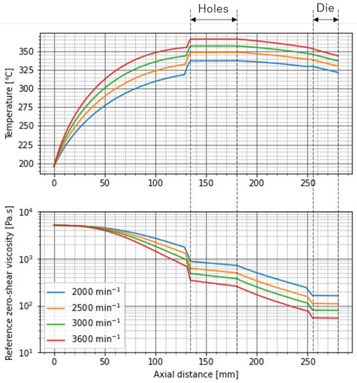 Then, the temperature gradient and the gradient for the zero-shear viscosity at are evaluated by using Equations (13) and (30). Then, the pressure, temperature, and zero-shear viscosity at are calculated, where is a size of discretization for z axis. Repeating the calculations, we obtain at . The temperature and zero-shear viscosity at the exit are updated iteratively so that the calculated values of the temperature and zero-shear viscosity at are close enough to and . After the iterative calculations, we obtain for all z which satisfy the initial conditions.
