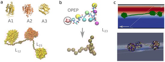 A1A2A3 system. Panel (a). Molecular representation of the A1A2A3 construct modelled in this work. In the top part we show the individual domains (from X-ray PDB structures) represented by their secondary structures. In the bottom part we show the A1A2A3 construct including the flexible amino acid sequences connecting the domains. Panel (b). The linker chain is represented using the OPEP (top) and a single bead (bottom) models for the amino acids. Panel (c). Representation of the Couette flow generated in the simulation box of the A1A2A3 system (top) with the velocity field represented by the colour gradient. In the (bottom) we highlight the local deformation of the velocity streamlines around the protein domains A1A2A3.
