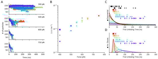 The comparison between the distribution shapes and the empirical data strongly suggests that exponential decay does not apply well to the high force regime investigated, 400–750 pN. A lower force of 300 pN was also simulated but hardly reached the unfolding criterion on the simulation time frame. In this regard, the inverse Gaussian model offers much more realistic predictions. Moreover, in the exponential fit, estimated rates strongly deviate from the exponential dependence on applied force predicted by Bell’s model. Taken together, the results suggest that the dynamics of the system is highly diffusive in this high-force regime and that the observed kinetics cannot be simply related to a phenomenological energy barrier extracted from lower-force experiments. Hence, the observed dependence on force does not arise from easier crossing of a single well-defined free-energy barrier, but can be understood as increased drift velocity in the driven Brownian model. This agrees to what already observed in other molecular simulations, where the A2 mechanical unfolding is a multi-step process proceeding via several metastable states [].
