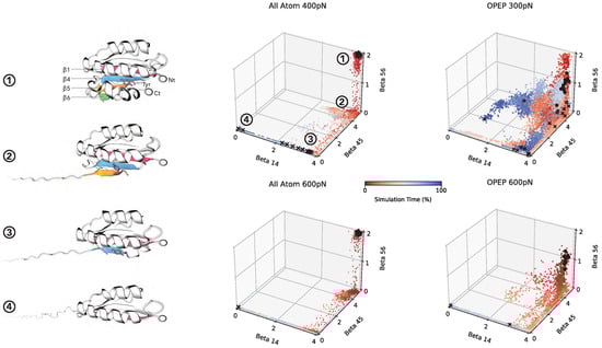In order to characterize the progress of the unfolding that leads to the exposure of Tyr, we visually inspected the trajectories and singled out three sequential structural events: (i) the unzipping of strands 5 (res. 129–136) and 6 (res. 155–157); (ii) the unzipping of strands 4 (res. 108–114) and 5; and (iii) the unzipping of strands 1 (res. 3–10) and 4. We note that the unfolding of the A2 domain in the force-clamp setup begins from the C-terminus and demonstrates transient intermediate states in accordance with prior experimental and structural studies [,]. A pictorial representation of this sequence is given in Figure 3, left panels.