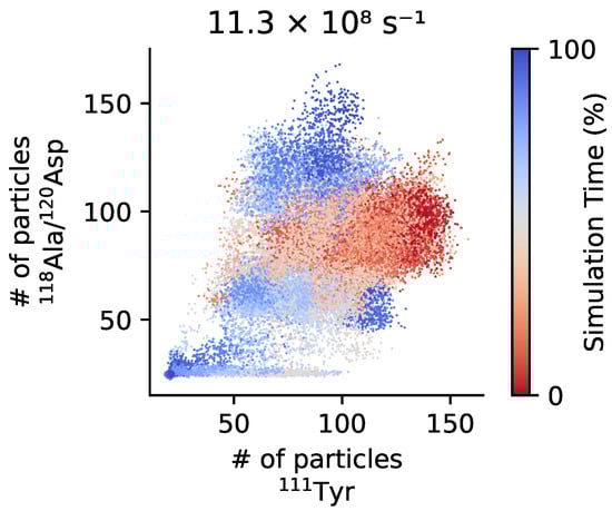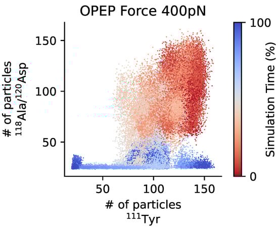 Exposure of the cleavage and the recognition sites of A2 domain under force. The CG trajectories of force unfolding (400 pN) are projected as a scatter plot on the 2D space of the coordination number of 111Tyr (cleavage site) and that of 118Ala/120Asp (recognition site). The sequential exposure of the recognition site before the cleavage site can be appreciated. Trajectories are colored according to progress from red (beginning) to blue (ending).
