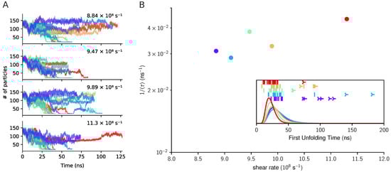 By using the same strategy adopted for the force-induced unfolding, we quantified the unfolding kinetics by applying the diffusive model (the most adequate to fit the data), see Figure 5. By comparing the characteristic unfolding time with those obtained for the simulation of A2 under force, we deduce a semi-quantitative match among the shear values 9–10 × 109 s−1 and a directional mechanical force of 500–700 pN.