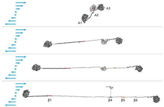 The following are available online at https://www.mdpi.com/article/10.3390/polym13223912/s1, Figure S1: Coarse-grain potential for inter-domains linker. Figure S2: A1A2A3 under shear. Figure S3: Exposure of the cleavage and the recognition sites of A2 domain. Figure S4. Unfolding path of the A2 domain under shear. Figure S5: Extension of the A2 domain within the A1A2A3 construct under shear. Figure S6: A1A2A3 under shear. Figure S7: Effective load force on A2 terminals. Figure S8: Effective load force on A2 terminals. Figure S9: A1A2A3 rotation under shear. Figure S10: A1A2A3 collapse/extension dynamics.