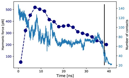Tensile force. Time evolution of the mechanical force acting at the A2 terminus connected to the linker (dark blue). The force is estimated as a moving average over a time window of 2.1 ns. We also report the time evolution of the coordination number of Tyr (light blue) until the full exposure criterion is reached, as shown by the vertical line at 38 ns.