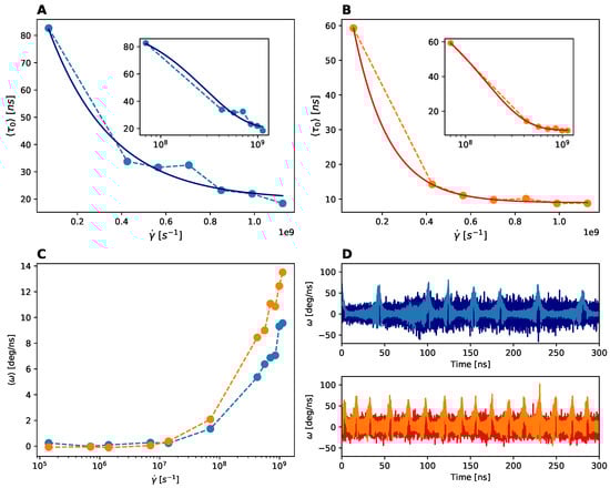 Rotational dynamics. Panels (A,B). Characteristic rotational time of the A1 (left panel) and A3 (right panel) domains with respect to the central A2 domain as a function of the simulated shear rates . In the inset the data are represented in log-x scale for shear rates values . Panel (C). Angular velocity computed for the A1 (blue) and A3 (orange) domain rotation relative to A2 as a function of the shear rate. Panel (D). Time evolution of the angular velocity for the A1 (top) and A3 (bottom) domains, for two shear rates (light blue and orange) and (dark blue and red).