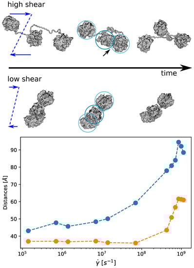 In the same spirit of previous work [], but at a very different scale, we inquire how the threshold individuated for the rotational dynamics, transposes in a neat transition of the A1A2A3 fragment conformational state. Namely, we quantified the propensity of the three domains to stay detached and elongated, or collapsed. The results are summarised in Figure 10 where we show the time-averaged value of the inter-domain distances as a function of the shear rate. It is clear that at low shear rate the three domains stay in a collapsed configuration and move as a compact unique entity. On the contrary, at high shear rate, the three domains extend cyclically (see also Figure S10). The individuated threshold coincides with the that of the rotational dynamics, –. For a longer chain constituted by a larger number of domains, this threshold should decrease (although different models predict different scaling [,]). However, the structure of a vWf monomer [], and the sequential linking of its domains, is expected to generate a hierarchical scale of detachment, elongation, and unfolding events. The collapsed structure observed at low shear rate, and also the cyclic collapse/extension dynamics typical of the high shear rate regime, point on the critical role of the relative domain interaction for self-inhibition toward the cleavage.