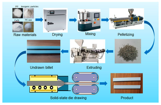 The PP, inorganic filler, and corresponding additives were weighed according to the proportion. The raw materials were dried and mixed evenly in a high-speed mixer. After mixing, the above raw materials were added to the twin-screw extruder for pelletizing and then were fed to the single-screw extruder for extruding. The inorganic particle-filled polypropylene composite billets, with a cross-section of 18 mm × 12 mm, were obtained by extrusion. Then, the billet was put into the preheating device and heated for 1 h before drawing. Under the action of the tractor, the drawn samples with a cross-section of 12.2 mm × 4 mm were obtained through the drawing die, and the drawing ratio was 4.4. The drawing ratio was the ratio of the billet size to the section at the die exit [32]. The preheating temperature was the same as the drawing temperature. The detailed preparation procedure is shown in Figure 1.