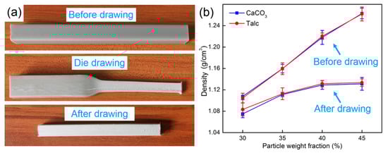 Figure 2. (a) PP/inorganic particle composites before, during, and after the drawing; (b) densities of the PP/inorganic particle composites before and after drawing.