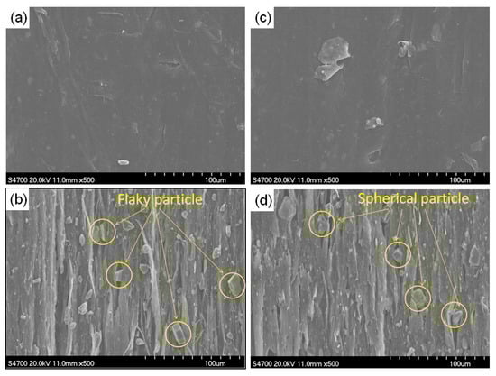 Figure 3. SEM micrograph of the composites: (a) PP/Talc composites before drawing; (b) PP/Talc composites after drawing; (c) PP/CaCO3 composites before drawing; (d) PP/CaCO3 composites after drawing.