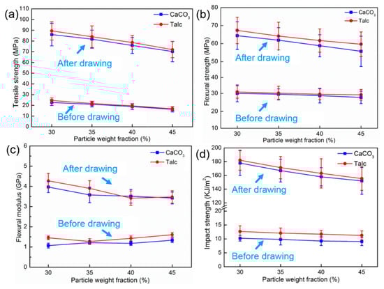 The mechanical behaviors of PP/inorganic particle composites with different inorganic particle contents before and after drawing are shown in Figure 4. It can be seen from Figure 4a that with the increase in inorganic particle content, the tensile strength of PP/inorganic particle composites before and after drawing showed the same downward trend. When the inorganic particle content was 30 wt%, the tensile strength of the undrawn PP/Talc and PP/CaCO3 composites were only 24.53 and 22.69 MPa, respectively. After drawing, the tensile strength of the PP/Talc and PP/CaCO3 composites reached 89.40 and 85.97 MPa, respectively, which were 264.5% and 219.6% higher than the tensile strengths of the undrawn samples, respectively. The flexural properties of the samples showed the same downward trend as the tensile strength, shown in Figure 4b,c. But the difference was that the flexural strength of the PP/Talc composites after drawing was slightly higher than that of the PP/CaCO3 composites. For a content of 45 wt% inorganic particles, the flexural strength of the PP/Talc composites was 59.65 MPa, which was 3.94 MPa higher than that of the PP/CaCO3 composites. The value of the flexural modulus was not much different; for 45 wt% inorganic particles, the PP/Talc and PP/CaCO3 composites after drawing reached 3.48 and 3.43 GPa, respectively. In addition, it was undeniable that the flexural properties of the samples were greatly improved. Compared with the samples before drawing, the flexural strength and the modulus of the drawn samples with 45 wt% content were nearly doubled and tripled. The comparison of the impact strength of the samples before and after drawing is also shown in Figure 4d. Before drawing, there were almost no differences in the impact strength under different particle contents; however, both the PP/Talc and PP/CaCO3 composites showed a downward trend after drawing. The impact strength of the drawn PP/Talc composites was slightly higher than that of the drawn PP/CaCO3 composites, which was due to the toughening effect of the Talc’s flake-shaped structure.