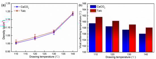Figure 5. (a) Density of PP/inorganic particle composites with different drawing temperatures; (b) Vicat softening temperature of PP/inorganic particle composites with different drawing temperatures.