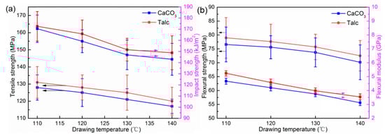 Figure 6. The mechanical properties of the drawn PP/Talc and PP/CaCO3 composites with differ-ent drawing temperatures: (a) tensile strength and impact strength; (b) flexural strength and flex-ural modulus.