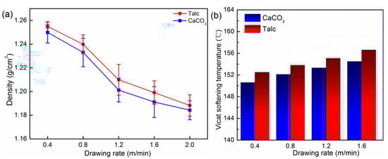 Figure 8. (a) Density of PP/inorganic particle composites with different drawing speeds; (b) the Vicat softening temperature of PP/inorganic particle composites with different drawing speeds.