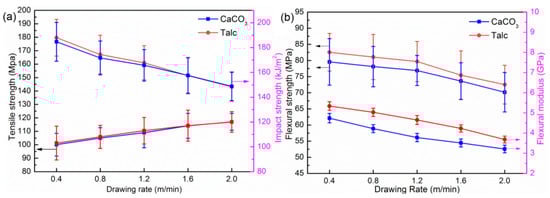 Figure 9. The mechanical properties of the drawn PP/Talc and PP/CaCO3 composites with differ-ent drawing rates: (a) tensile strength and impact strength; (b) flexural strength and flexural modulus.