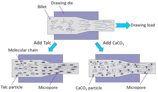 The principle of processing CaCO3 or Talc filled PP composites by solid-state die drawing method is shown in Figure 11, which can well explain the process of micropore formation, molecular chain orientation, and fibrous structure formation during the drawing process. However, in this work, the die drawing behaviors of the PP/inorganic particle composites under different drawing ratios were not studied, only the die with a drawing ratio of 4.4 was used for investigation. The correlation mechanism between the drawing ratio and the mechanical properties of the PP/inorganic particle composites is our next focus of research.
