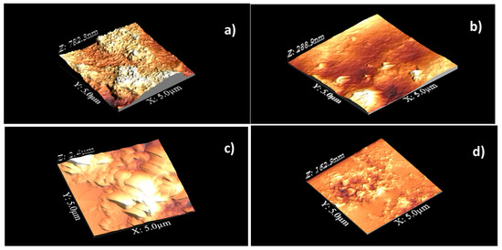 Topographic 3-D images of CP20 unoriented (a) and oriented (b), of CP40 unoriented (c) and oriented (d). Scanned area: 5 µm × 5 µm.