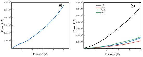 In order to characterize the ionic transport in terms of selectivity, linear sweep voltammetry (LSV) measurements were performed. Our previous studies [19,20,36] confirmed that the linear sweep voltammetry is a suitable tool to study transport through the non-ionomeric membranes. Differently from the permeability test, the ionic transport measured in a setup for LSV allows cation transport in one direction. For the experiment, 0.1 M solutions of hydrochloric acid and different monovalent chlorides were used to establish the selectivity of used membranes. For most cases of CP-based membranes, the three-region division of the LSV curve was not evident and the I-V curves have a linear tendency. Only in the case of CP40 and 0.1M NaCl solution the ohmic, limiting current, and overlimiting regions were observed (see Figure 5). This fact confirms the permselective nature of CP20 and CP40, what was expected based on results obtained for CP copolymer modified in 36% [36]. Permselectivity of membranes indicates that ionic transport occurs only via cation flux.