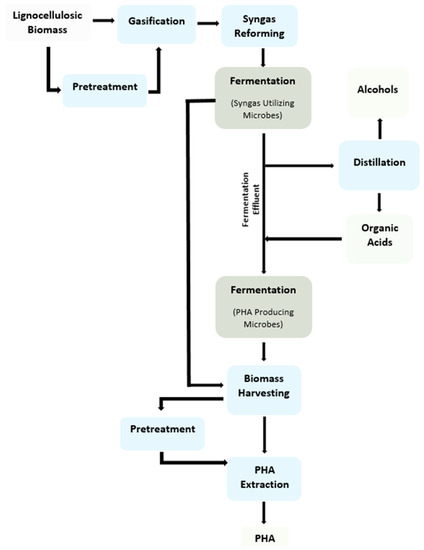 Apart from waste utilization, syngas fermentation also provides a perspective for product diversification and valorization. Upon the optimal exploitation of microbes, various products, such as ethanol, higher alcohols, organic acids, and bio-polymers, could result from syngas fermentation [1,2,3,5]. Although most of the acetogenic bacteria can utilize CO and H2 to produce alcohols and organic acids, some of them (most from the Clostridium species) can produce higher alcohols. Depending on the feed supplement and/or use of chain-elongating bacteria (e.g., Clostridium kluyveri) in the culture, the carbon chain in both acid and alcohol could be extended [6,7,8]. Syngas could also be directly fermented to polyhydroxyalkanoates (PHA) through phototrophic bacteria such as Rhodospirillum rubrum. Moreover, fermentation effluent from the acetogenic culture could act as a suitable feedstock for polymer production by PHA-producing microbes [9]. Similarly, the type of polymer, i.e., short-chain-length (scl) PHA and medium-chain-length (mcl) PHA, could be optimized through the carbon chain length of organic acid in the fermentation medium [10]. This paper reviews various aspects of syngas fermentation for the production of fuel and polymers. A scheme for the conversion of lignocellulosic biomass to syngas fermentation products is given in Figure 1.