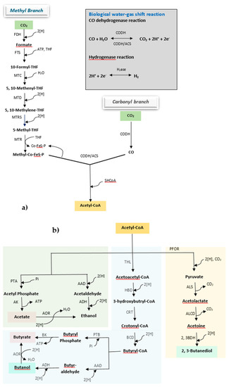 Metabolic processes for syngas conversion to diverse products through the Wood–Ljungdahl pathway (modified from Ciliberti et al. (2020)) [24]. (a) Conversion of syngas to acetyl-CoA and (b) conversion of acetyl-CoA to fermentation products. Abbreviations: AAD, alcohol/aldehyde dehydrogenase; ACS, acetyl-CoA synthase; ADH, alcohol dehydrogenase; AK, acetate kinase; ALDC, acetolactate decarboxylase; ALS, acetolactate synthase; AOR, aldehyde:ferredoxin-oxidoreductase; BCD, butyryl-CoA dehydrogenase; BK, butyrate kinase; CODH, CO dehydrogenase; Co-Fes-P, corrinoid iron-sulfur protein; CRT, crotonase; FDH, formate dehydrogenase; FTS, formyl-THF synthetase; HBD, 3-hydroxybutyryl-CoA dehydrogenase; HYA, hydrogenase; MTC, methenyl-THF cylcohydrolase; MTD, methylene-THF dehydrogenase; MTR, methyltransferase; MTRS, methylene-THF reductase; PFOR, pyruvate:ferredoxin oxidoreductase; PTA, phosphotransacetylase; PTB, phosphotransbutyrylase; THF, tetrahydrofolate; THL, thiolase.