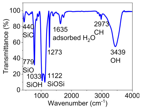 A Fourier-transform infrared (FT-IR) spectrum was prepared to characterize the functional groups of Pd@C–PS (Figure 2). The structure of the composite was approved based on the absorption bands noted at 3439, 1122, 1033, and 779 cm−1 for OH, Si–O–Si, Si–OH, and Si–O bonds, respectively. The appearance of two peaks at 2973 and 440 cm−1 confirmed the existence of carbon atoms in the composite structure, and these peaks were assigned to CH and SiC bonds, respectively [46].