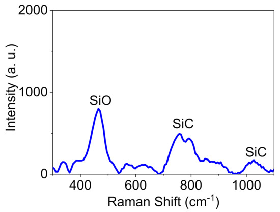 The Raman spectrum of Pd@C–PS also revealed peaks attributing to Si and SiC (Figure 3). The exact value of the Raman shift for Si in the composite is size-dependent and lies in the range of 470–520 cm−1 [47]. The appearance of the Si peak at about 470 cm−1 revealed that the sample contains particles with the size of about 10 nm. Moreover, Raman spectroscopy is considered a reliable method to assign SiC considering the appearance of peaks at around 760 and 1000 cm−1, which correspond to the transverse and longitudinal optical phonon modes, respectively [47].