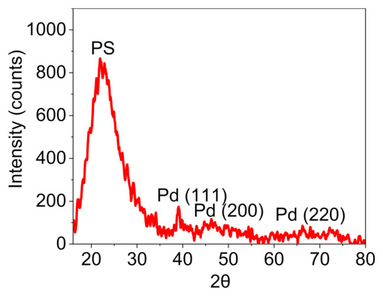 The X-ray diffraction (XRD) pattern of Pd@C–PS was prepared to determine diffraction peaks corresponding to Si and Pd. The peak of PS at 2θ = ~22.45 and peaks of Pd corresponding to (111), (200), and (220) verified the support structure and Pd doping (Figure 4) [39].