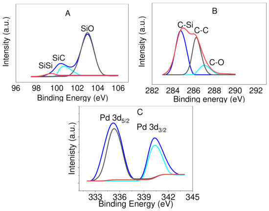 Deconvoluted XPS spectra of Pd@C–PS for the peaks ascribed to Si (A), C (B), and Pd (C).