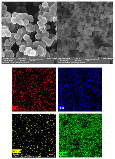 A microscopic study was conducted on Pd@C–PS to observe the surface topography, size, and shape distribution of the prepared particles (Figure 6). The obtained SEM images showed several uniform spherical particles, which were considered to be PS particles [47]. Elemental mapping was also carried for Pd@C–PS to observe the distribution of C and Pd atoms in the composite (Figure 6). This showed that the C atoms were uniformly dispersed on PS and that the C-doping improved the optical properties of PS; thus, a homogeneous support was obtained that was desirable for photo-induced reactions. Further, homogeneous distribution of Pd was observed in this analysis, indicating that a uniform catalyst was synthesized.