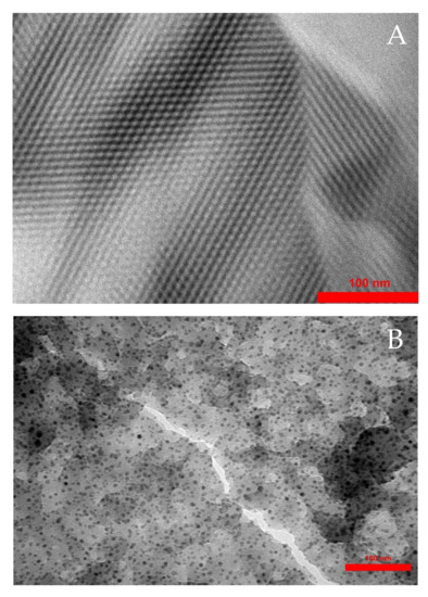 The decoration of Pd nanoparticles on the composite encouraged us to focus on obtaining higher resolution images of the produced structure using transmission electron microscopy (TEM) of C–PS and Pd@C–PS (Figure 7). The TEM micrograph of C–PS indicated a homogeneous mesoporous structure, which is consistent with previous reports [10]. To elucidate the deposition of Pd nanoparticles, a TEM micrograph of Pd@C–PS was also obtained, which showed that particles other than PS are present. These particles showed a different mass-thickness contrast than the other particles, confirming the existence of particles other than PS particles with an average size of 8–12 nm.