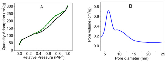 A Brunauer–Emmett–Teller analysis of Pd@C–PS provided valuable information about the structure (Figure 8). The adsorption and desorption isotherms at 77 K revealed a type II curve, indicating a mesoporous structure with a pore size of 2–50 nm. Moreover, the presence of some hysteresis in the adsorption and desorption isotherms demonstrated that the small amount of pore-blocking might be due to the presence of Pd nanoparticles [48]. The specific surface area was calculated to be 283 m2/g. Furthermore, the pore size distribution revealed a maximum size of 6.10 nm of the composite.