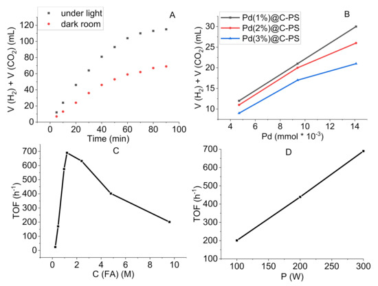 FA degradation toward H2/CO2 production: (A) Volume of the produced gases (H2 + CO2) as a function of reaction time, (B) Volume of the produced gases (H2 + CO2) as a function of Pd concentration at 10 min, (C) Catalytic TOF of the reaction as a function of FA concentration at 10 min, and (D) Catalytic TOF of the reaction as a function of light power at 10 min.