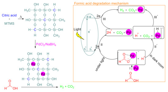 In our continued efforts to develop efficient catalytic systems [38,39,40,41], herein, we tried to utilize PS as a support for Pd nanoparticles to synthesis a new photocatalyst (Scheme 1). To transform PS into an efficient semiconductor for the powerful light absorption, doping of the polymer was carried out by C via a new procedure, including thermal treatment of methyltrimethoxysilane (MTMS) in the presence of citric acid (CA). The CA is an active starting material for the constructing C-based materials, in particular, when it is thermally treated [42]. This strategy would be a promising pathway for the synthesis of optically active support for the Pd nanoparticles to obtain a novel heterogeneous photocatalyst for formic acid degradation. Considering that the Pd tends to create complexes with formate ligands, we believe that the formation of the Pd-formate complex is inevitable (the path I, Scheme 1). The formed complex provides CO2 and H+ with losing two electrons (the path II, Scheme 1) [43], which the produced protons subsequently evolved to H2 by taking up the two electrons in the presence of Pd (path III, Scheme 1) [44]. However, it was shown that the reaction has proceeded in the absence of light in three steps, including: (a) the formation of Pd-formate, (b) releasing CO2 from Pd-formate, and formation of Pd-hydride, and (c) finally the reaction of hydride by a proton to produce H2 [45].