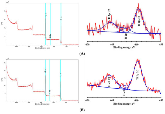 Survey XPS (left, bands for C1s, O1s, and Ti2p are marked in blue) and Ti2p (right, splitting is marked with blue lines) spectra of electrospun PMMA/5TiO2 (A) and PMMA/10TiO2 (B) composites.