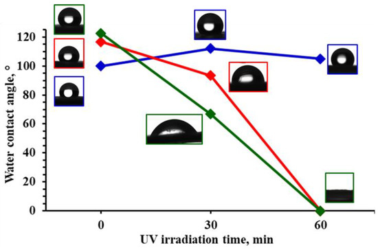 Water contact angles and digital images of water droplets on electrospun PMMA (blue), PMMA/5TiO2 (red), and PMMA/10TiO2 (green) composites before and after UV irradiation.