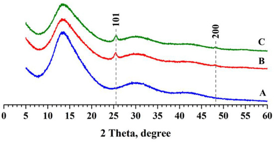 XRD patterns of electrospun PMMA (A), PMMA/5TiO2 (B), and PMMA/10TiO2 (C) composites.